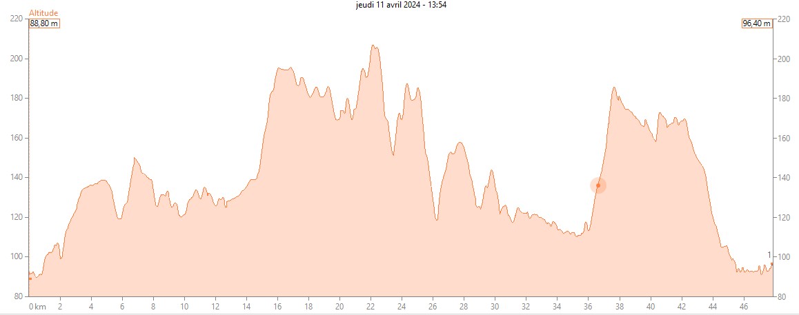 Une belle petite sortie tous les deux, avec une distance que j'adapte à la demande de Christelle (en général +ou- 50 kms, sans trop dépasser ce kilométrage) et pour ce parcours-ci un dénivelé correct.